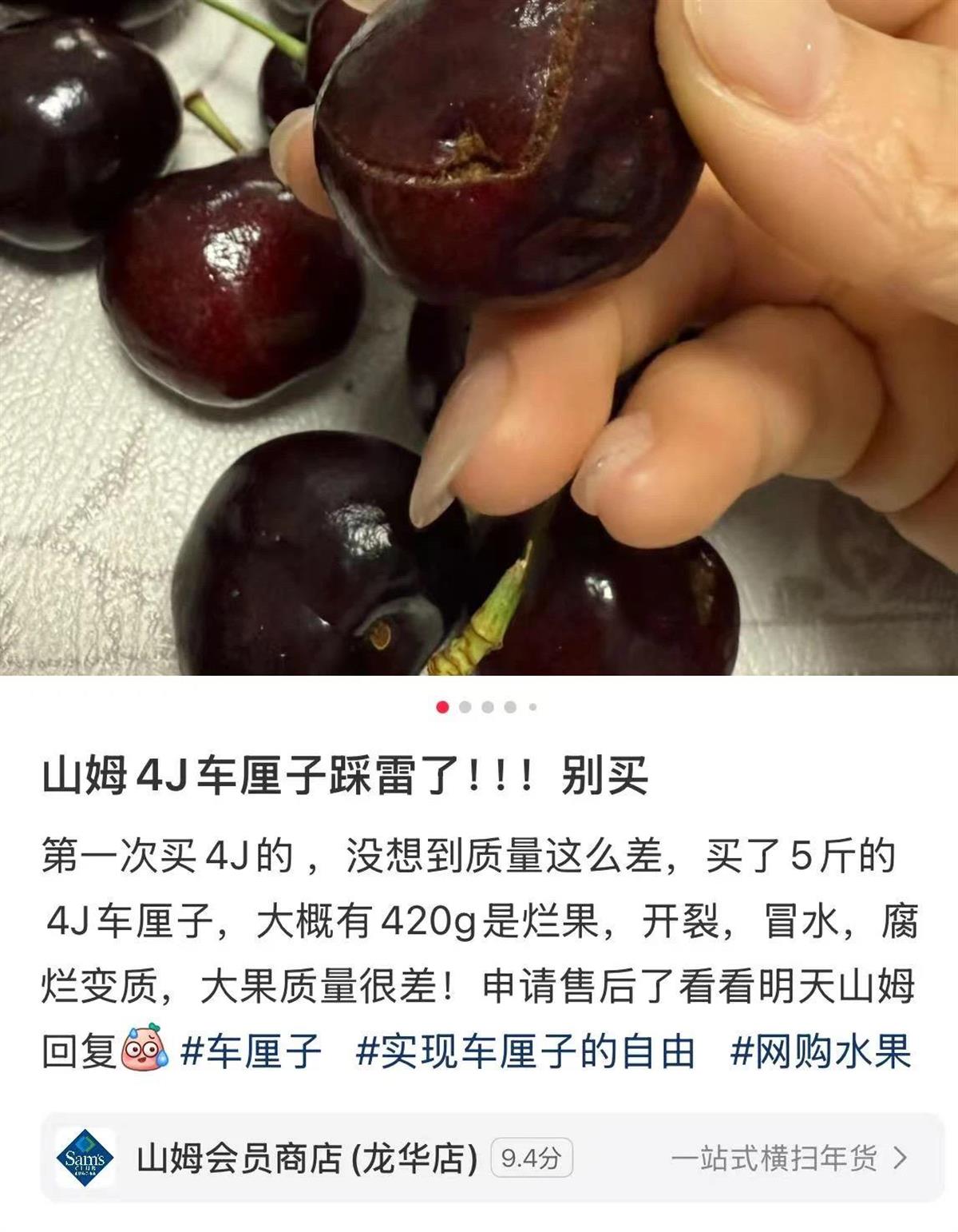 还有一位IP地址为南昌的消费者称,自己在山姆极速达上购买了价格为328元的十斤车厘子,结果果子有各种开裂、霉变,一箱内至少有三斤为坏果。