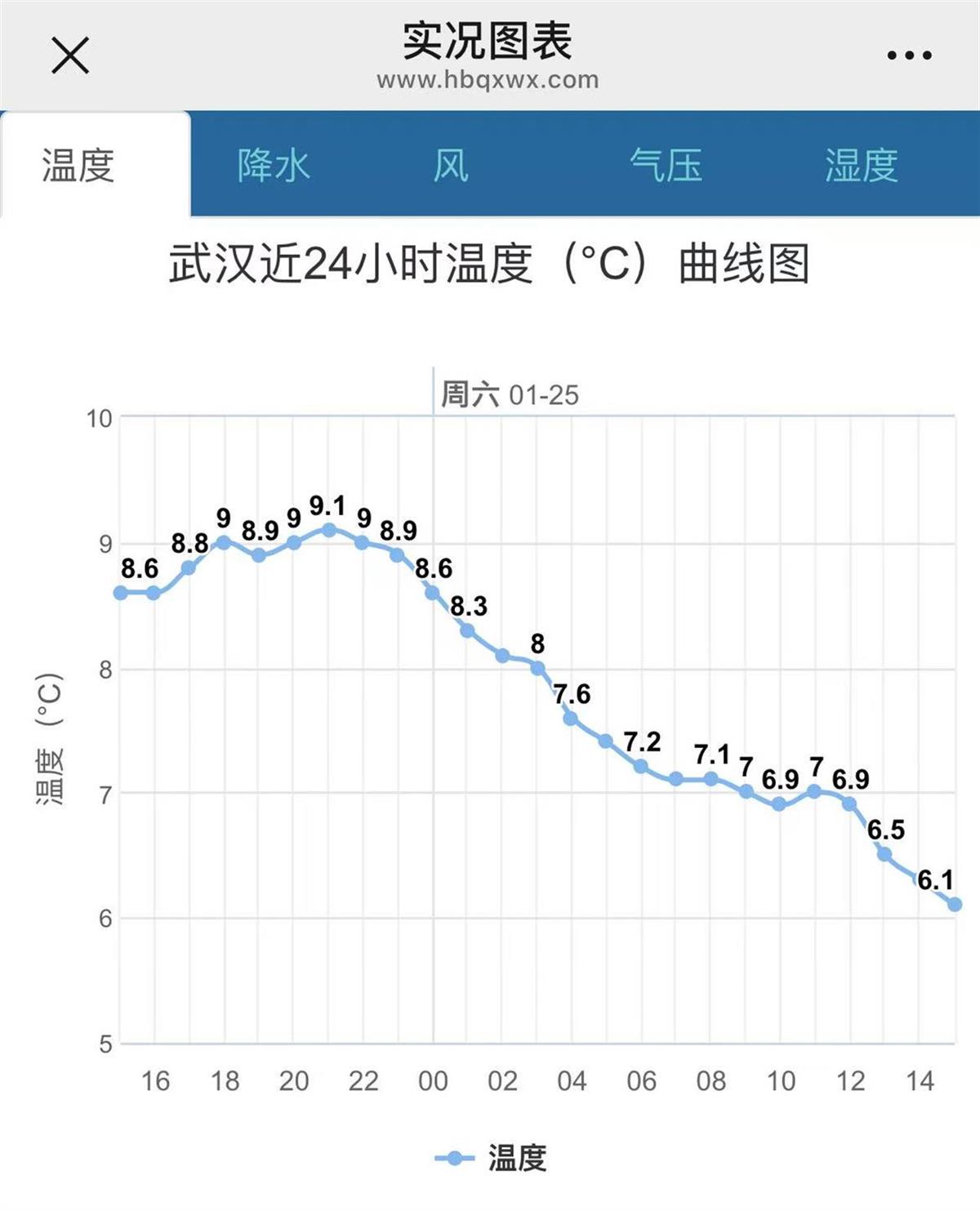 气象监测显示,武汉从昨夜(24日)开始到今天(25日)白天,气温下了个陡坡,昨夜接近10℃,今天白天气温在6-7℃,不过体感温度很低,比如傍晚6时40分,武汉气温5.5℃,体感气温仅1.4℃。