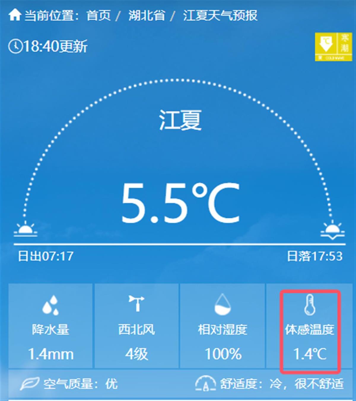傍晚6时40分,武汉气温5.5℃,体感气温仅1.4℃