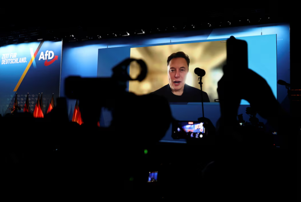 当地时间1月25日,美国企业家埃隆·马斯克以视频形式“现身”德国选择党在东部城市哈雷举行的一场竞选集会,称选择党是德国“最大的希望”。