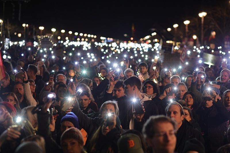 △1月25日,民众在柏林举行反对右翼极端主义的集会时高举手机灯光。