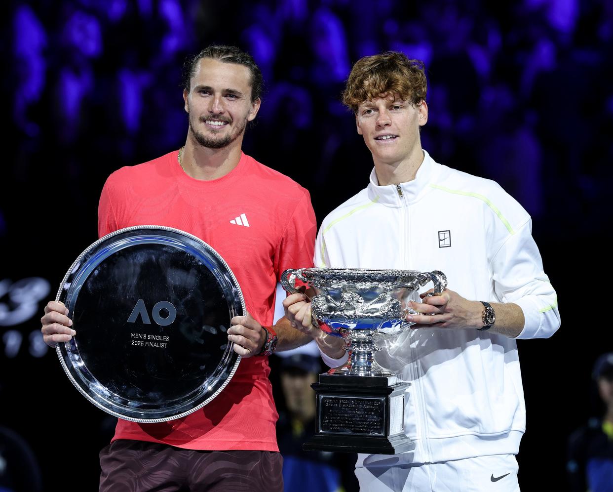 1月26日,辛纳(右)与兹维列夫在颁奖仪式上合影。新华社记者 马平 摄