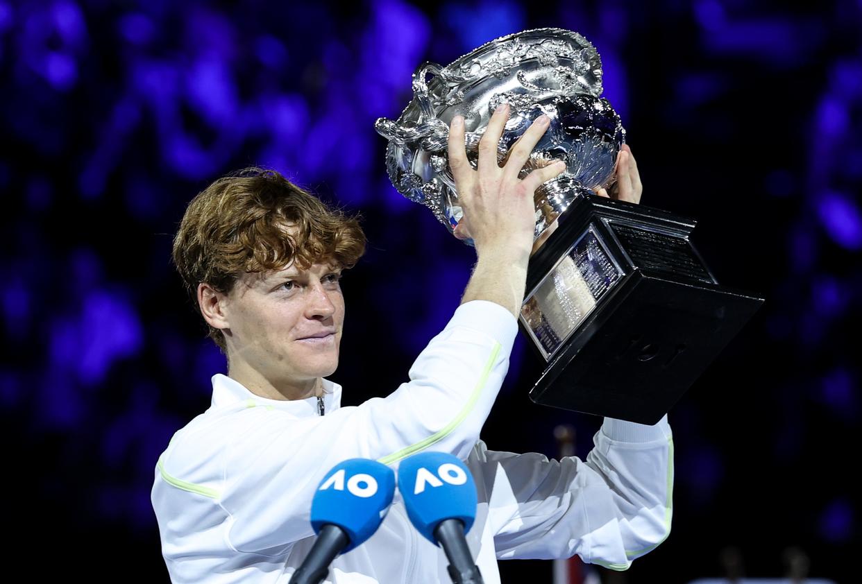 1月26日,辛纳在颁奖仪式上举起奖杯。新华社记者 马平 摄