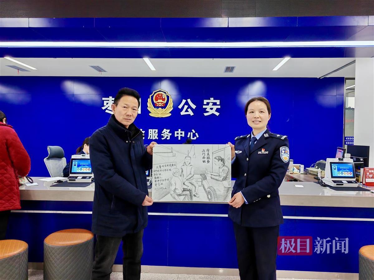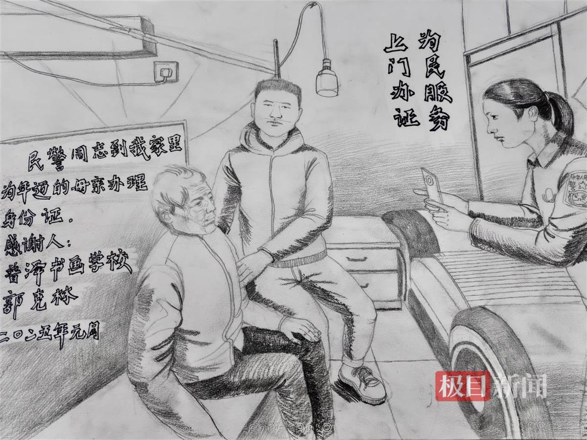“这本是一件平常的上门办证服务,却打动了现场的一家人。郭先生的女儿擅长绘画,她把我当时为老人拍照的场景画成了素描画。”邢娜说,收到这幅画后,她也被群众的热心所感动,“对我们警察而言,最好的新年礼物莫过于辖区平安无事、群众满意点赞。拿着这张画,我对这句话有了更直接生动的认识。”