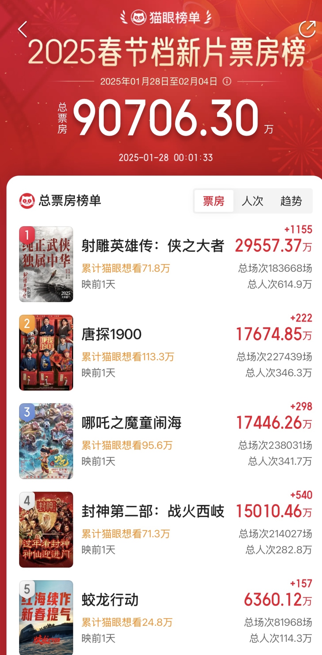 据猫眼专业版数据,截至1月27日24时,2025春节档预售总票房超9亿元,为影史春节档预售票房第2名。这一预售成绩已超越2024年春节档预售票房(7.25亿元),也刷新影史春节档预售票房最快破8亿元的纪录。档期内共4部影片预售破亿,分别是《射雕英雄传:侠之大者》《唐探1900》《哪吒之魔童闹海》《封神第二部:战火西岐》。
