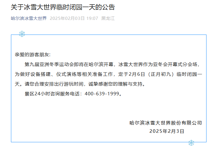 2月3日晚,哈尔滨冰雪大世界发布闭园公告,原文如下: