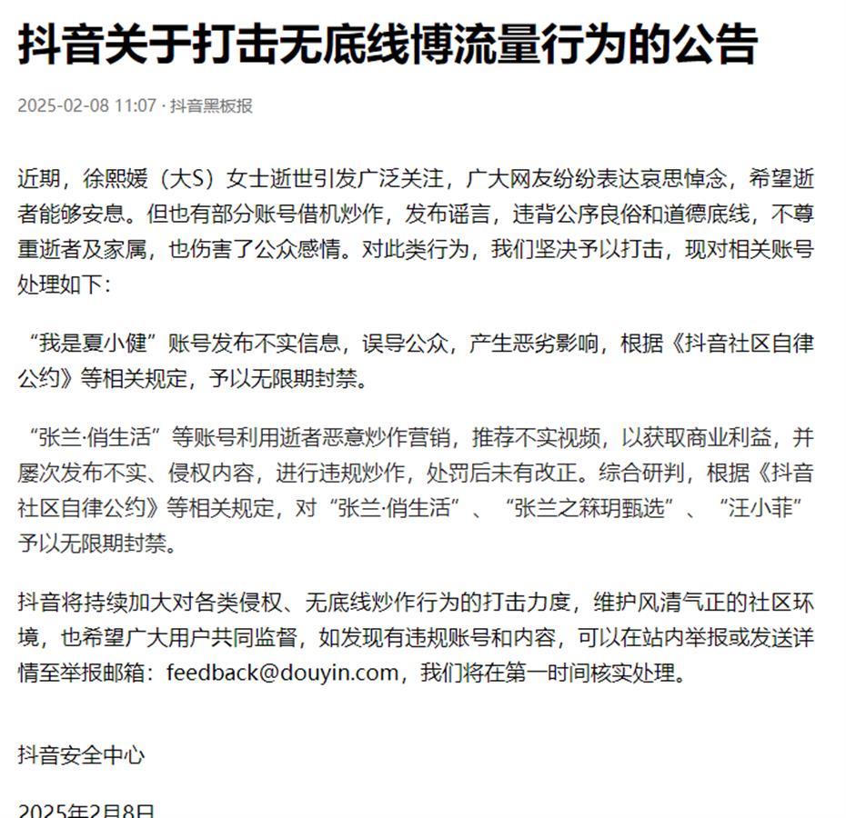 2月8日,抖音安全中心发布公告称,近期,徐熙媛(大S)女士的逝世引发了广泛的社会关注,无数网友纷纷表达哀思与悼念,但是有部分账号借机炒作,发布谣言,不仅违背了公序良俗,也对逝者及其家属造成了极大的伤害。