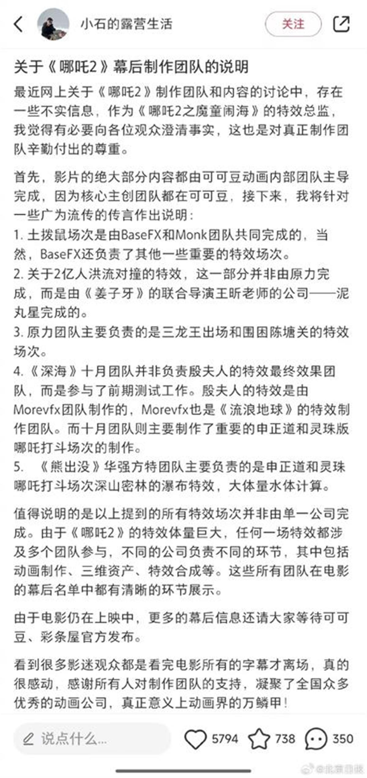 2月8日,《哪吒之魔童闹海》视效总监石超群发文,针对一些传言做了回应,列举了原力动画、《深海》十月团队、华强方特团队、BaseFX和Monk团队等国内知名动画团队在《哪吒2》中所负责的制作内容。