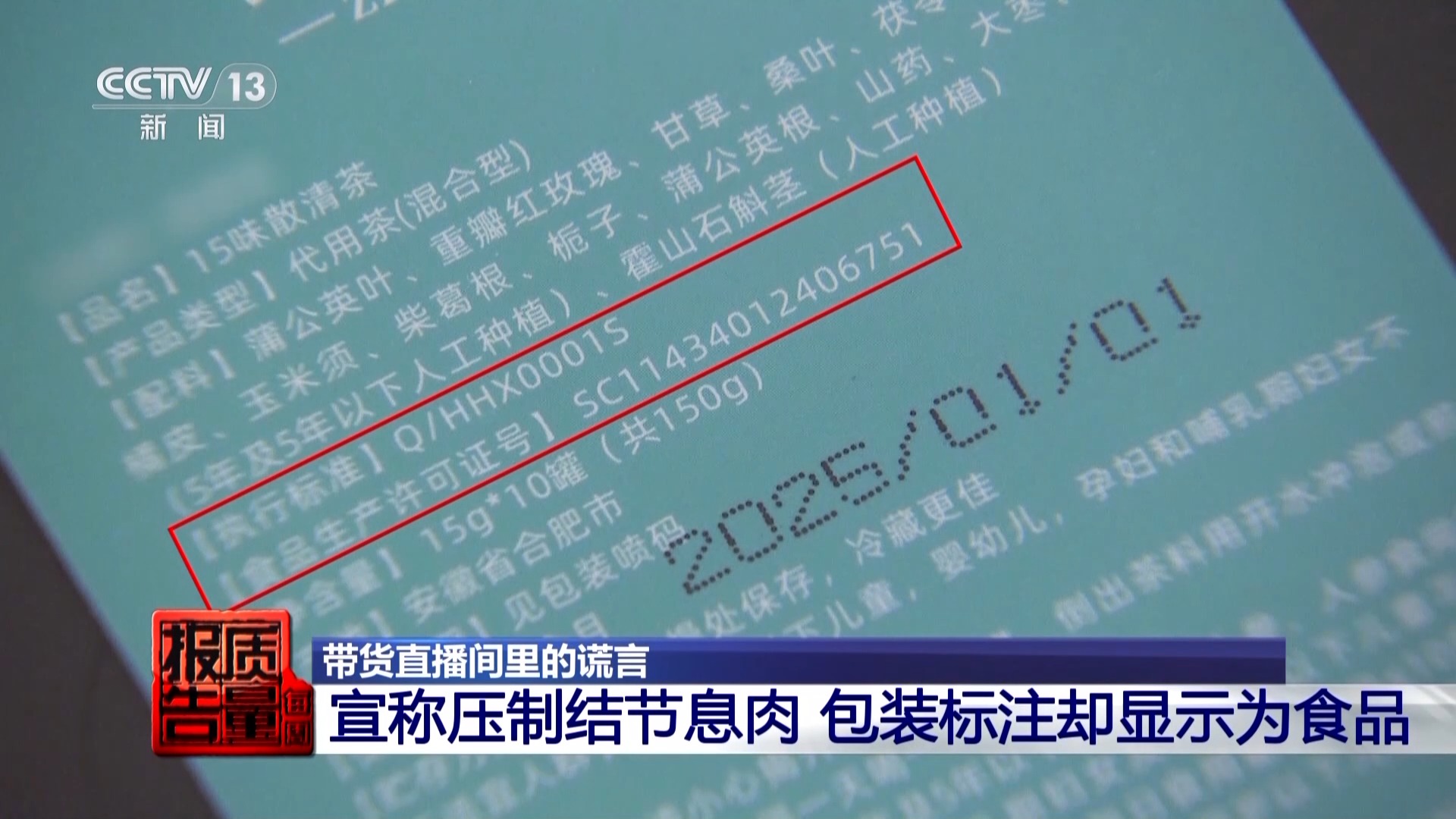 什么样的产品会有所谓“震撼”的效果呢?记者下单购买了直播间推销的这款宣称具有压制结节、囊肿和息肉功效的产品。收到货后记者发现,产品外包装上标注“品名”为“15味散清茶”“产品类型”为代用茶。记者注意到,产品包装上的执行标准,是一种食品标准。包装上明示的食品生产许可证号,表明该产品属于食品。