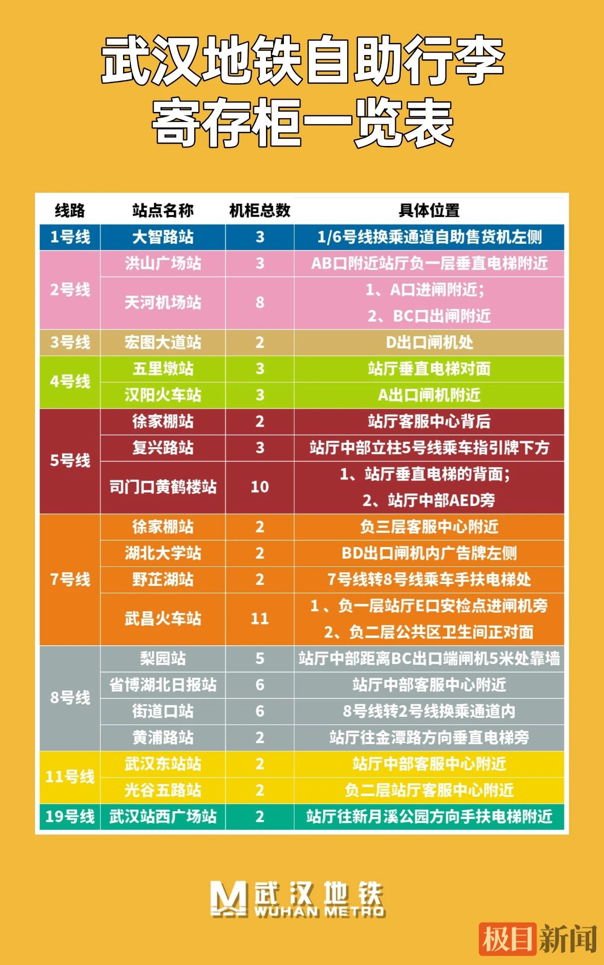 11日上午,极目新闻记者在2、4号线换乘站洪山广场站看到,自助行李寄存柜位于付费区内靠近AB出口处,也就是说乘客购票并经过安检后,才能将物品寄存。柜子为亮黄色外观,十分醒目,有一人多高,和超市内常见的寄存柜十分类似。柜门分为大中小三种不同规格,小柜可存双肩包,中柜可放小号的登机箱,大柜则最大可塞进32寸的大号行李箱。具体收费标准为:小柜2元/小时,每1天20元封顶;中柜3元/小时,每1天30元封顶;大柜4元/小时,每1天40元封顶。