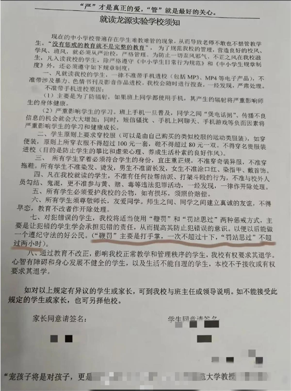 龙源实验学校此前给家长的一份“就读龙源实验学校须知”第七条称,对犯错误的学生,该校将适当使用“鞭罚”和“罚站思过”两种惩戒方式,主要是为让犯错的学生学会承担犯错的责任,从而提高其防止犯错误的意识。备注还称,“鞭罚”主要是打手掌,一次不超过10下,“罚站思过”不超过2小时。