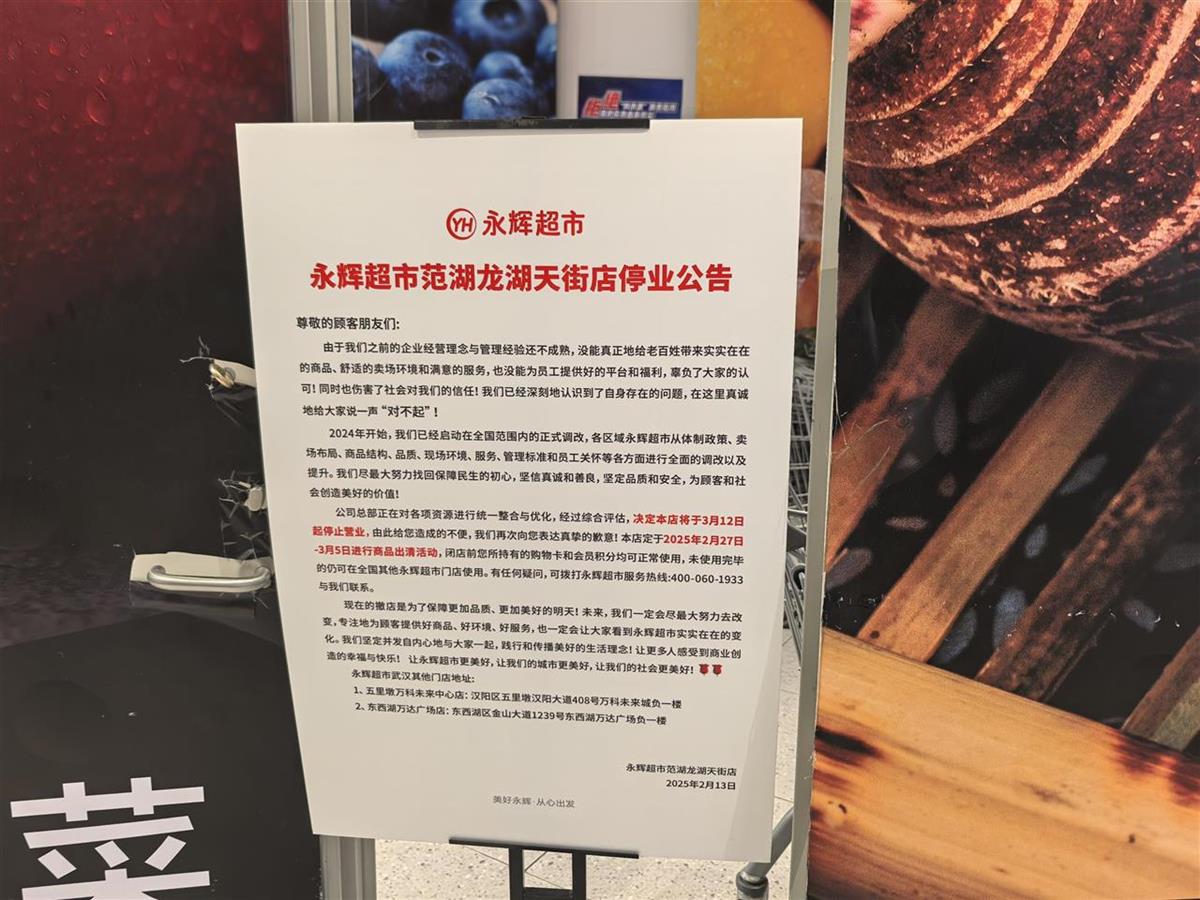 近日,有网传消息称,武汉永辉超市范湖龙湖天街店即将闭店。2月18日,极目新闻记者在该超市看到,超市门口已贴出闭店通知,进入营业尾期。