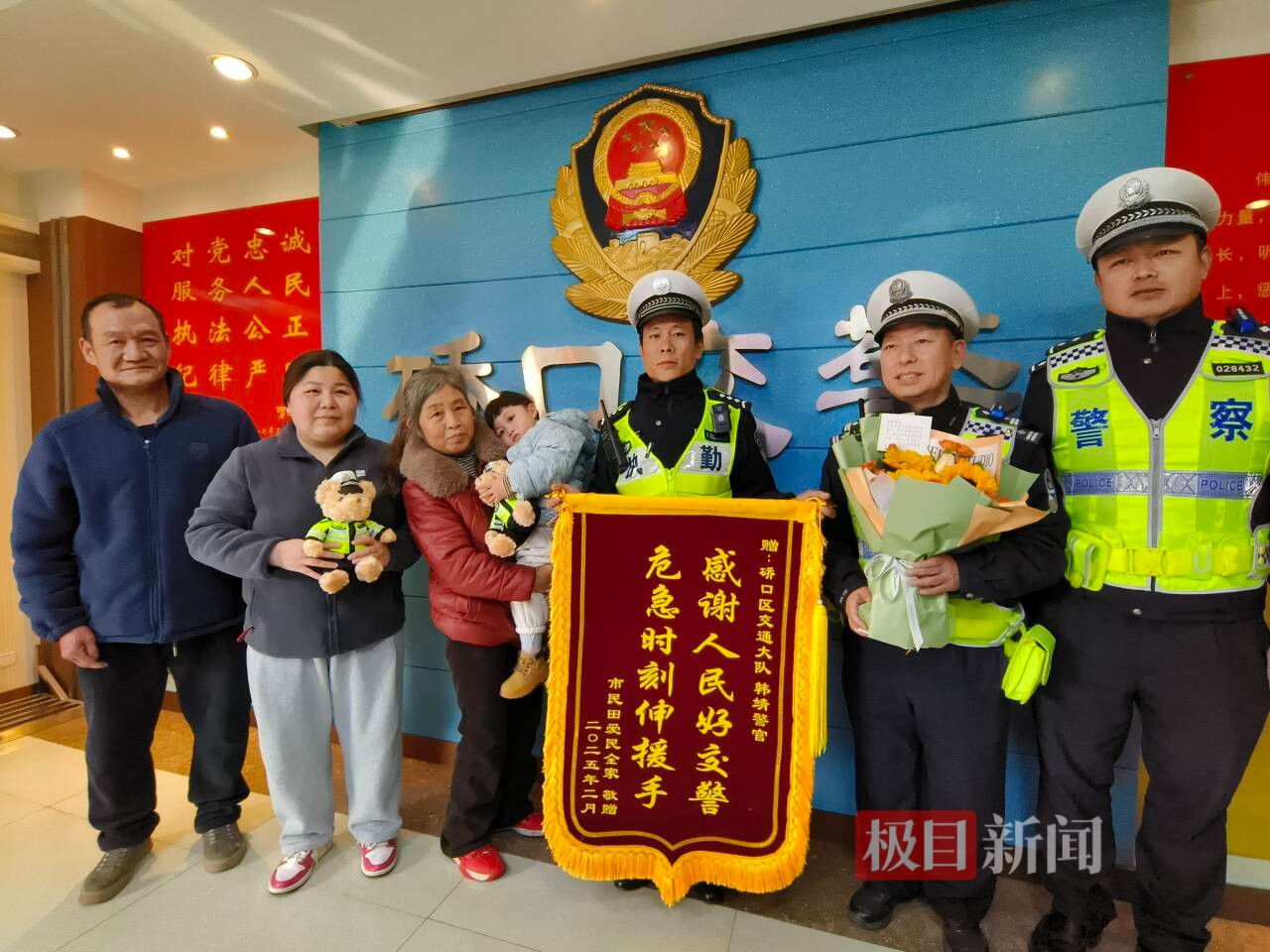 “来,孩子,让叔叔再抱抱你!”2月24日上午9时30分许,市民黄女士和公公、婆婆带着已经康复出院的孩子来到武汉市硚口区交通大队,向救命恩人、辅警韩靖送来锦旗,韩靖高兴地接过孩子,脸上满是喜悦的笑容。
