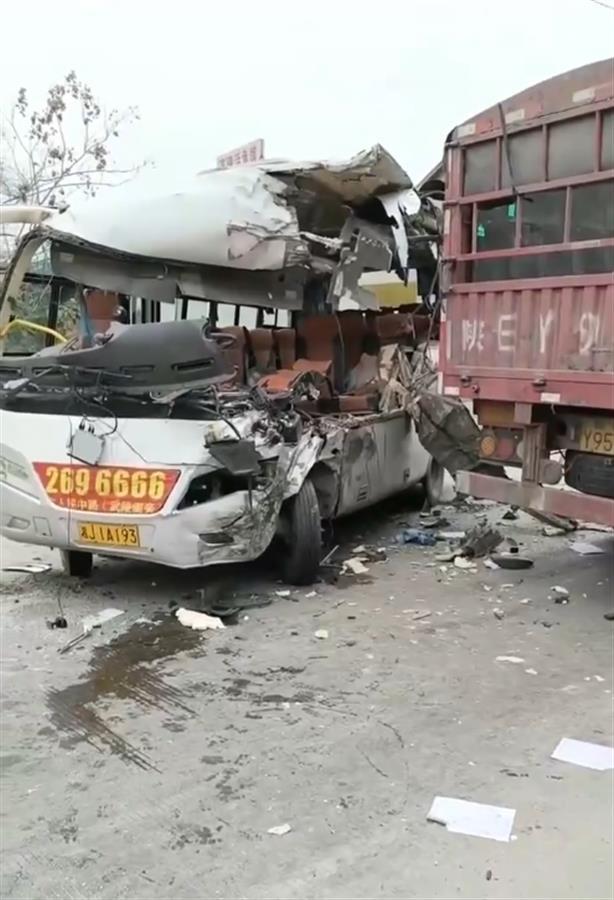 据现场视频显示,客车车身驾驶室一侧损毁严重,有消防和医护人员到场救治。