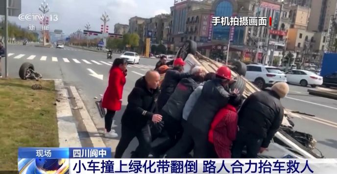 2月25日,四川阆中市七里巴都大道上演了惊险又暖心的一幕。一辆白色轿车撞上道路中间绿化带的条石后导致翻车,多名路过的群众赶来帮忙合力抬车救人。