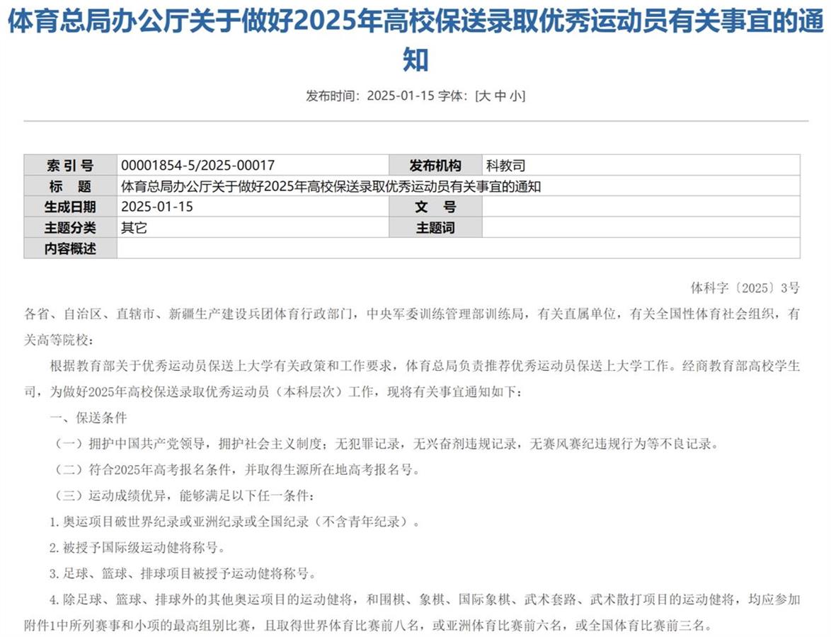 今年1月,国家体育总局办公厅发布关于做好2025年高校保送录取优秀运动员有关事宜的通知。记者看到,通知里写着“根据教育部关于优秀运动员保送上大学有关政策和工作要求,体育总局负责推荐优秀运动员保送上大学工作。”此外,还列举了保送条件。