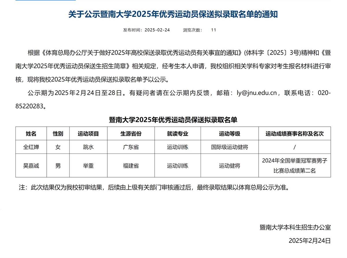 2月24日,暨南大学公示2025年优秀运动员保送拟录取名单通知,全红婵在列。记者在通知中看到,拟录取名单显示,跳水运动员全红婵拟就读暨南大学运动训练专业,运动等级为国际级运动健将。公示期为2月24日至28日。