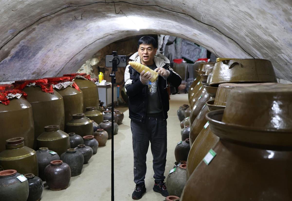柳州螺蛳粉制作技艺非遗传承人陈伟在一家老酸水菌种库通过社交媒体介绍酸笋(图源:新华社)