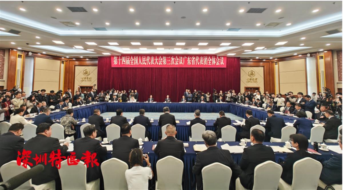 3月6日下午,十四届全国人大三次会议广东省代表团在住地举行全体会议,继续审议政府工作报告,审查计划报告和草案、预算报告和草案,来自107家境内外媒体的267名记者到会旁听。在发言环节,中外记者们受邀在会场内采访,近距离拍摄记录和报道代表们审议审查报告时的发言;在媒体提问环节,会场互动热烈、别开生面,到会记者纷纷举手提问。黄坤明、王伟中、张虎、郭永航、覃伟中、艾学峰、王雄飞等代表分别作答。