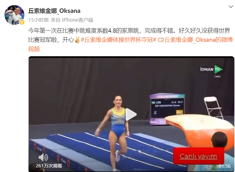 随后,在个人社交账号上,丘索维金娜发文:“今年第一次在比赛中跳难度系数4.8的冢原跳,完成得不错。好久好久没获得世界比赛冠军啦,开心”