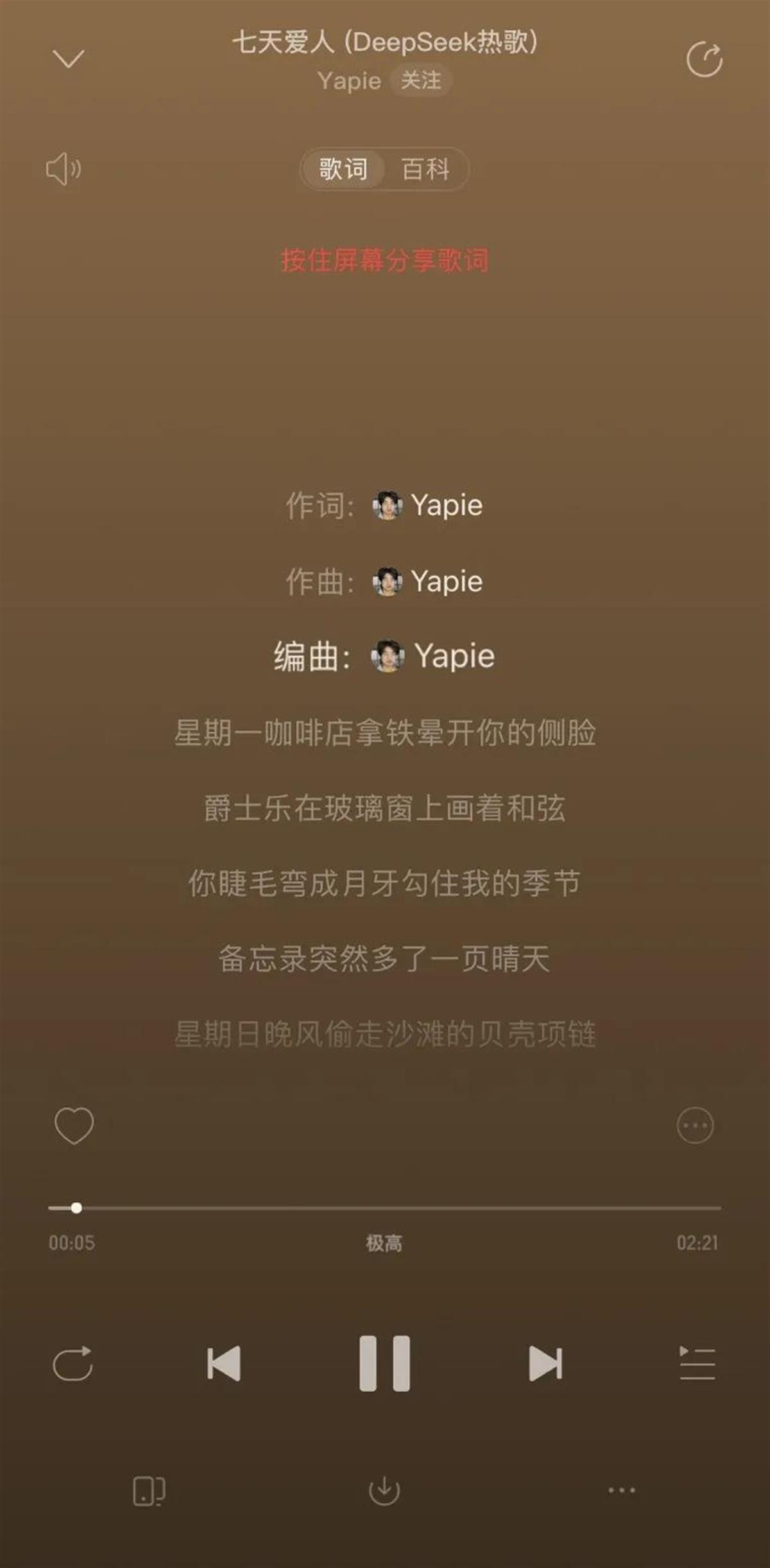 在媒体采访中,Yapie表示,“我认为它(DeepSeek)写词能力很强,有深度和内涵,比现在有的口水歌词强太多了,有些音乐人几年都写不出一首好歌,我现在用DeepSeek教大家写出了很多不错的作品,很多网友在我的评论区里晒出了自己用DeepSeek创作的歌曲。”他还表示,创作出来的歌曲《七天爱人》版权属于自己,也获得了几万块钱的收益。