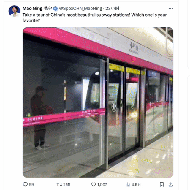 近日,外交部发言人毛宁发布了一段“中国最美地铁站”的视频,展示了全国13座地铁站。毛宁在视频的配文中称:Take a tour of China’s most beautiful subway stations! Which one is your favorite?(中国最美地铁站之旅,你最喜欢哪一个?)
