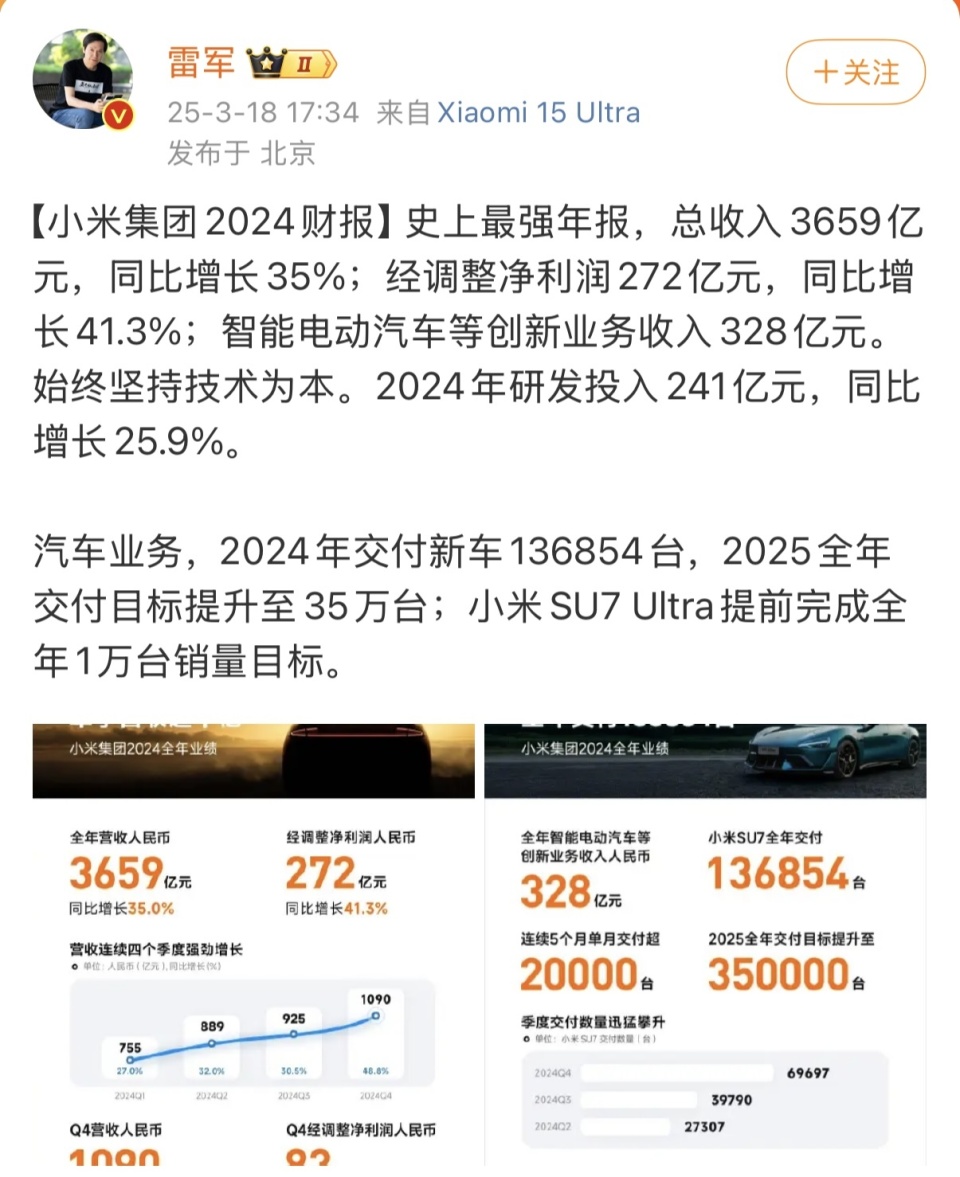 小米集团公布2024年财报,雷军:“史上最强年报”