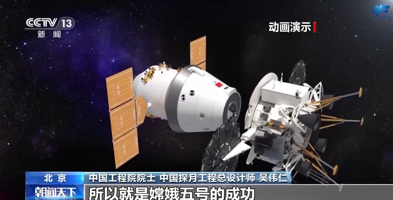 中国工程院院士 中国探月工程总设计师 吴伟仁:当时就想利用嫦娥五号来验证我们后续载人登月技术,载人登月就是在轨道上交会对接,然后人下去探测,探测完后月面起飞,在轨道上交会对接,然后人再进入返回器,返回器再和轨道器脱离,脱离过后,返回器把人送回地球。所以嫦娥五号的成功,为未来我们载人登月奠定基础,几乎把所有的关键技术都验证了一遍。