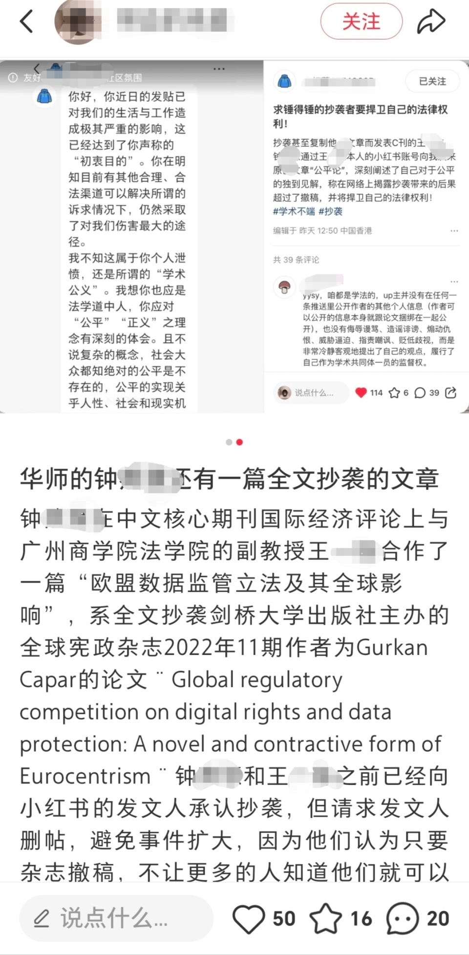 然而,关于钟某某被指抄袭的风波还未平息。大皖新闻记者注意到,近日,在某社交平台上,有网民发布信息称,华南师范大学的钟某某和广州商学院的王某某合作发表在《国际经济评论》上的一篇名为《欧盟数据监管立法及全球影响》的论文,是抄袭了一家某外杂志2022年刊登的一篇论文。