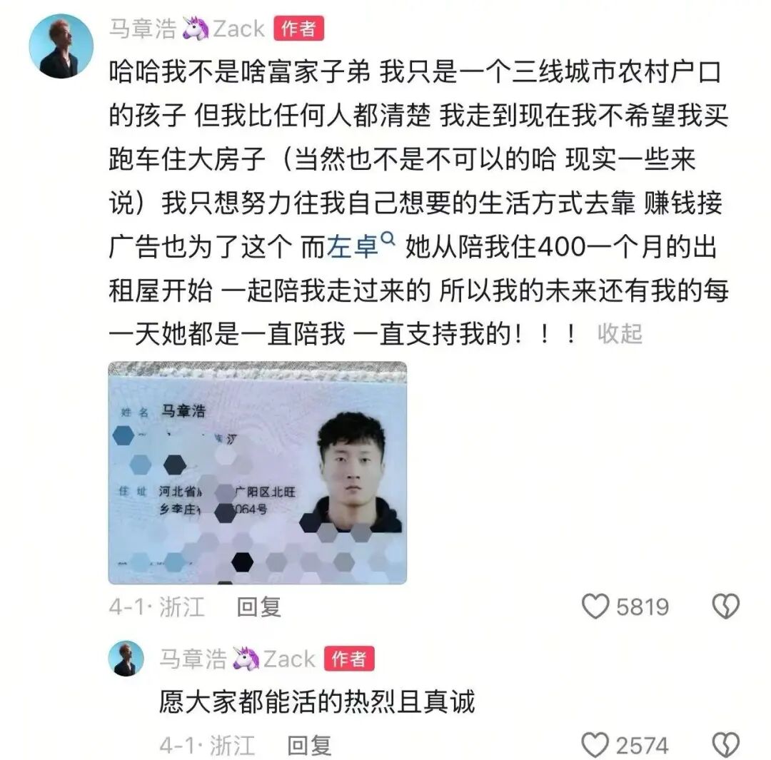 此前,马章浩曾在评论区表示:“我不是啥富家子弟,我只是一个三线城市农村户口的孩子。但我比任何人都清楚,我走到现在不希望买跑车住大房子。我只想努力往我自己想要的生活方式去靠,赚钱接广告也是为了这个。”