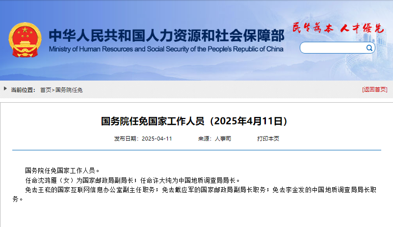 任命沈鸿雁(女)为国家邮政局副局长;任命许大纯为中国地质调查局局长。