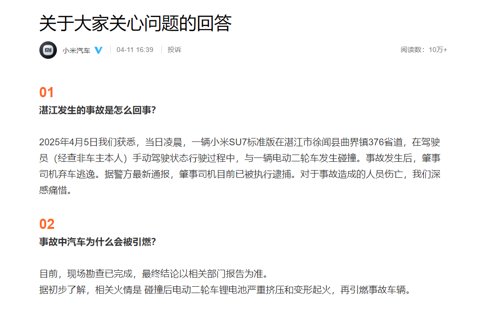 2025年4月5日我们获悉,当日凌晨,一辆小米SU7标准版在湛江市徐闻县曲界镇376省道,在驾驶员(经查非车主本人)手动驾驶状态行驶过程中,与一辆电动二轮车发生碰撞。事故发生后,肇事司机弃车逃逸。据警方最新通报,肇事司机目前已被执行逮捕。对于事故造成的人员伤亡,我们深感痛惜。