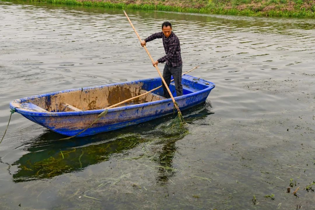 吴志峰在鱼塘打捞水草