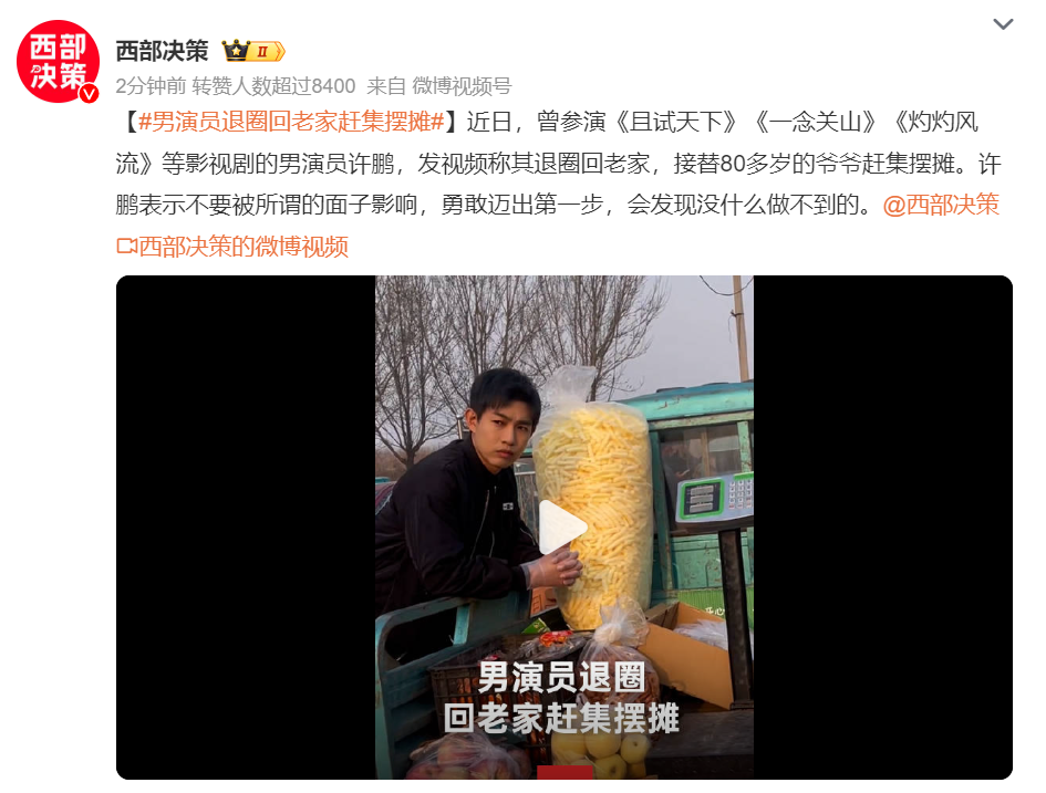 4月14日,#男演员退圈回老家赶集摆摊#冲上微博热搜第一。