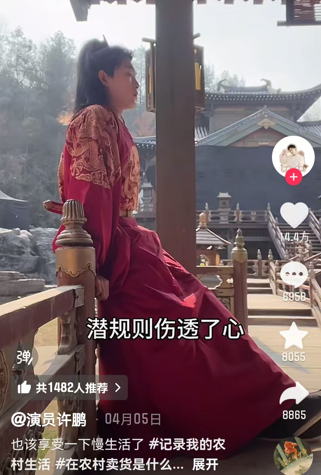 近日,曾参演《且试天下》《一念关山》《灼灼风流》等影视剧的男演员许鹏,发视频称其退圈回老家,接替80多岁的爷爷赶集摆摊。许鹏自曝被行业潜规则伤透了心,不想妥协,想在29岁的年纪为自己活一次。他表示不要被所谓的面子影响,勇敢迈出第一步,会发现没什么做不到的。