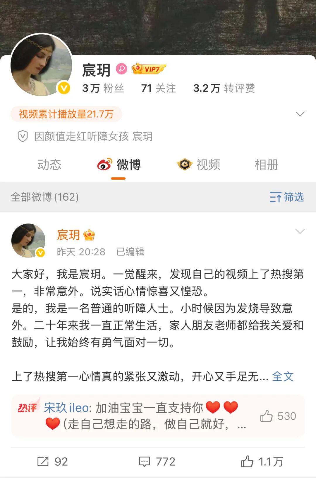 她在4月22日通过社交平台发文回应:“我是一名普通的听障人士。小时候因为发烧导致意外。二十年来我一直正常生活,家人朋友老师都给我关爱和鼓励,让我始终有勇气面对一切。”