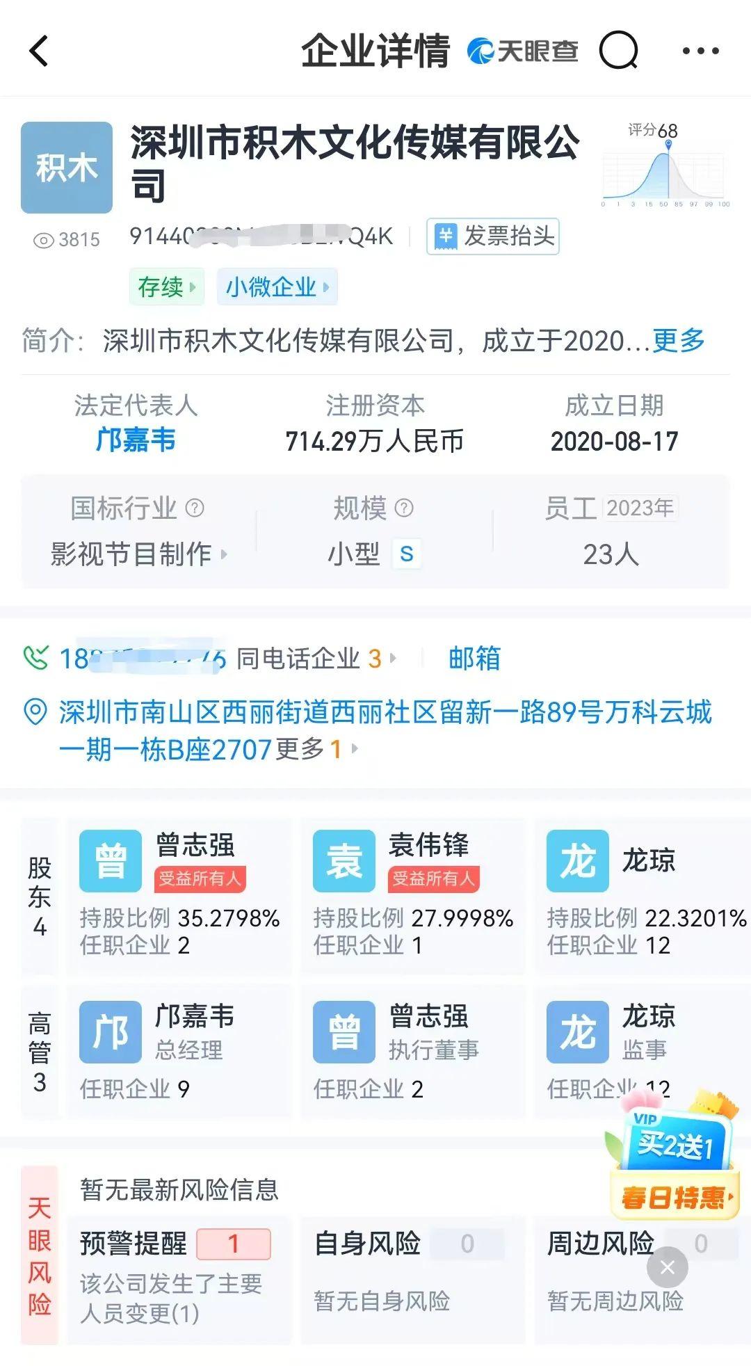 天眼查信息显示,深圳市积木文化传媒有限公司成立于2020年,位于广东省深圳市,注册资本:714.29万元人民币,以从事广播、电视、电影和录音制作业为主。经营范围主要包括影视多媒体设计、文化活动策划、从事广告业务、经营电子商务、化妆品零售等,2023年年报显示参保员工为23人。