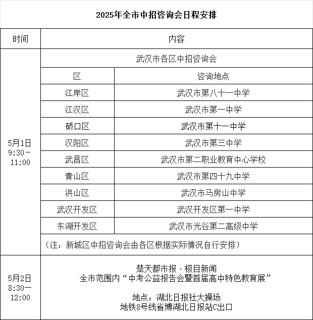4月25日,极目新闻记者获悉,2025年武汉市中招咨询会安排出炉。
