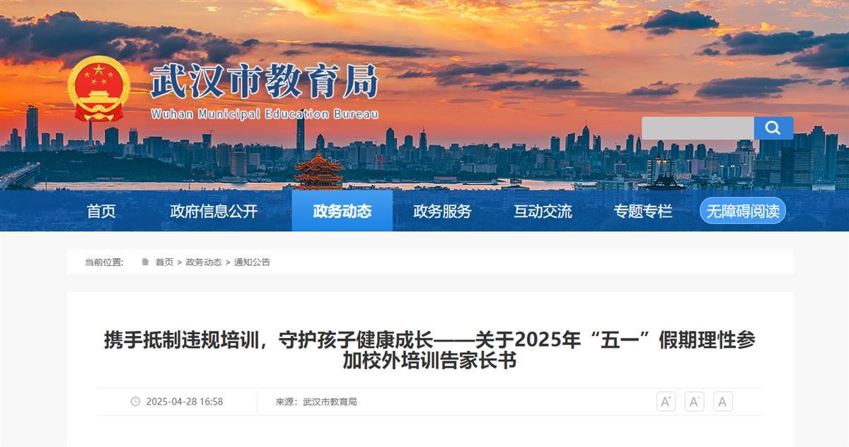 4月28日,武汉市教育局官网发布《携手抵制违规培训,守护孩子健康成长——关于2025年“五一”假期理性参加校外培训告家长书》。具体如下: