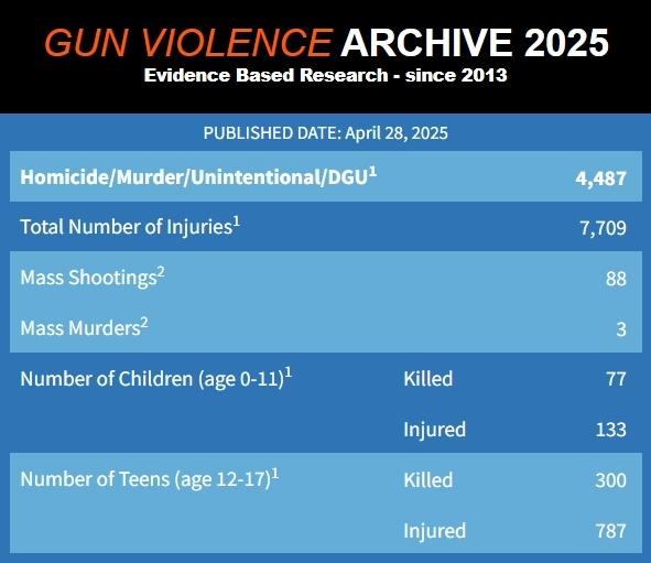 据美国“枪支暴力档案”网站最新统计,截至当地时间4月28日,今年以来,美国已发生88起造成至少4人死伤的群体性枪击事件,377名17岁以下未成年人死于枪支暴力。