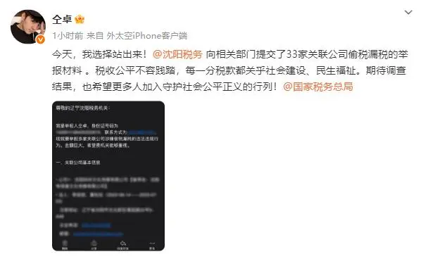 4月29日,演员仝卓发布微博实名举报33家关联公司偷税漏税: