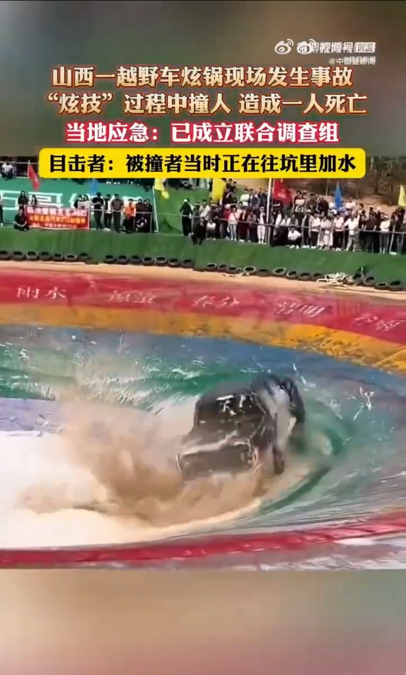 近日,山西蒲县网红“聚宝盆”汽车炫锅场发生一起事故。据媒体报道,事故发生于4月24日,造成一人死亡,事故具体原因还在调查中。现场视频显示,一汽车在该场地内漂移时撞到坑边一人。