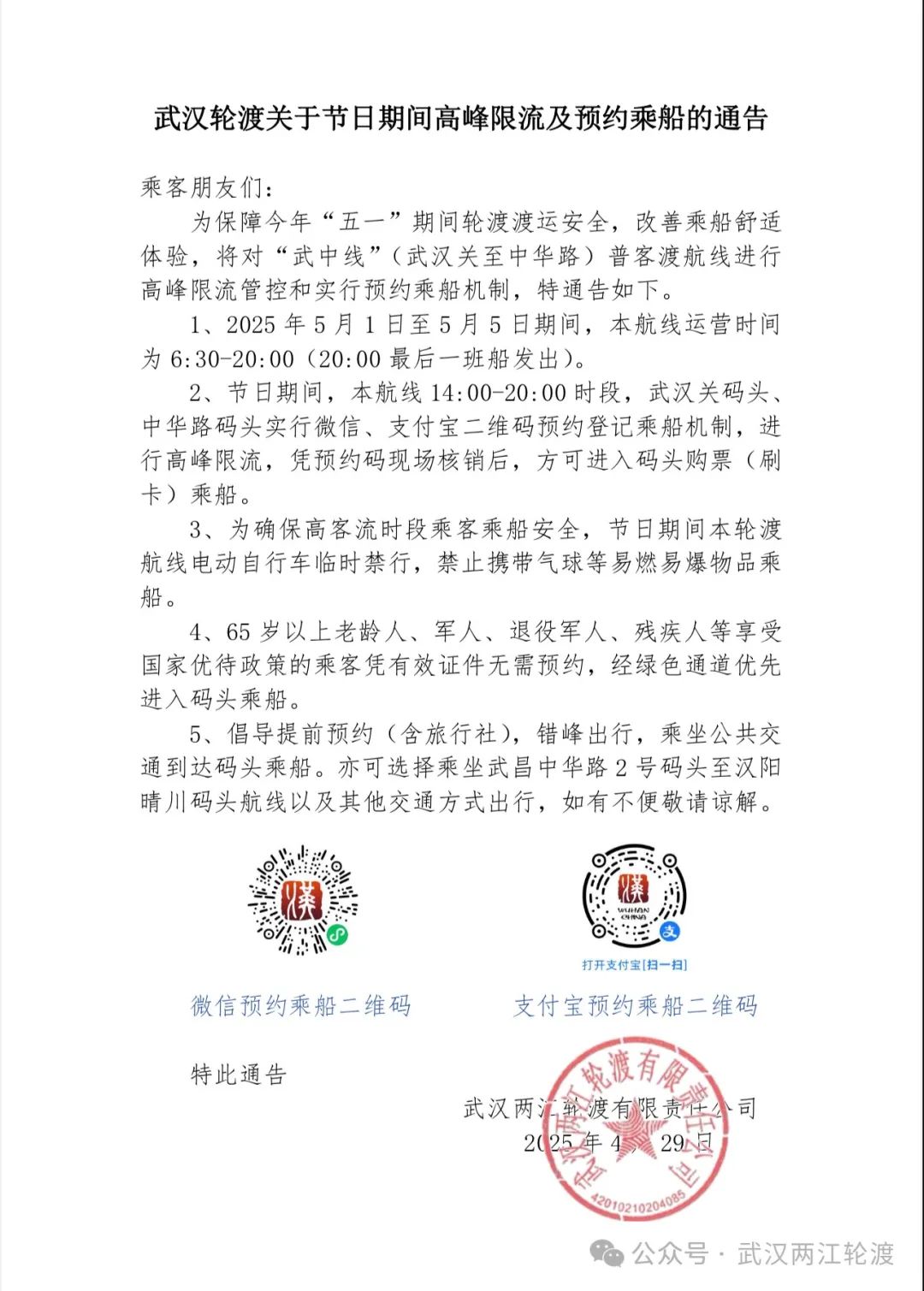 4月29日晚,“武汉两江轮渡”微信公众号发布《武汉轮渡关于节日期间高峰限流及预约乘船的通告》。全文如下: