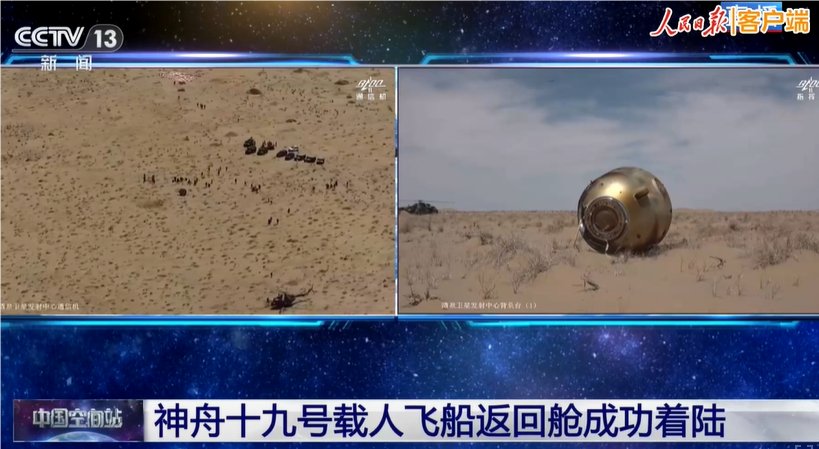 新华社快讯:神舟十九号载人飞船返回舱在东风着陆场成功着陆。