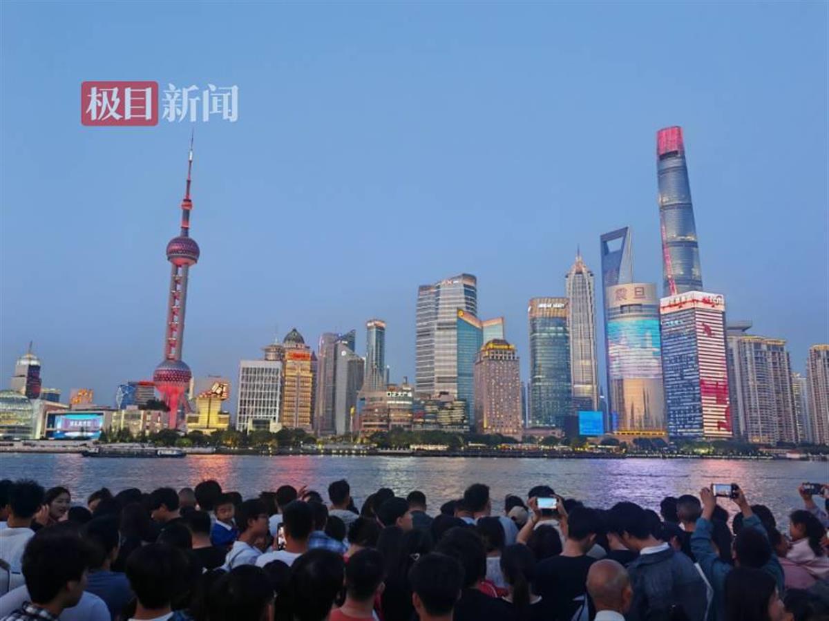 五一假期首日,夜幕降临,游客纷纷涌入上海外滩。