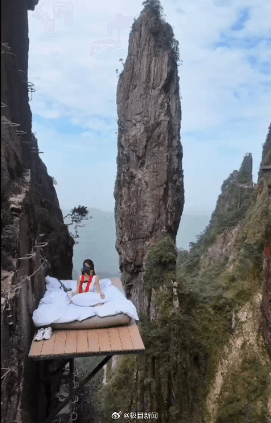 连日来,湖南郴州莽山五指峰景区推出的“悬崖睡床”项目走红,该睡床位于海拔1600米的悬崖边,是景区飞拉达的一个打卡点。记者注意到,莽山五指峰景区短视平台官方账号上,曾对悬崖睡床项目做过宣传,视频画面中,一名女子坐在睡床上,身上佩戴有安全绳,身旁便是悬崖峭壁。