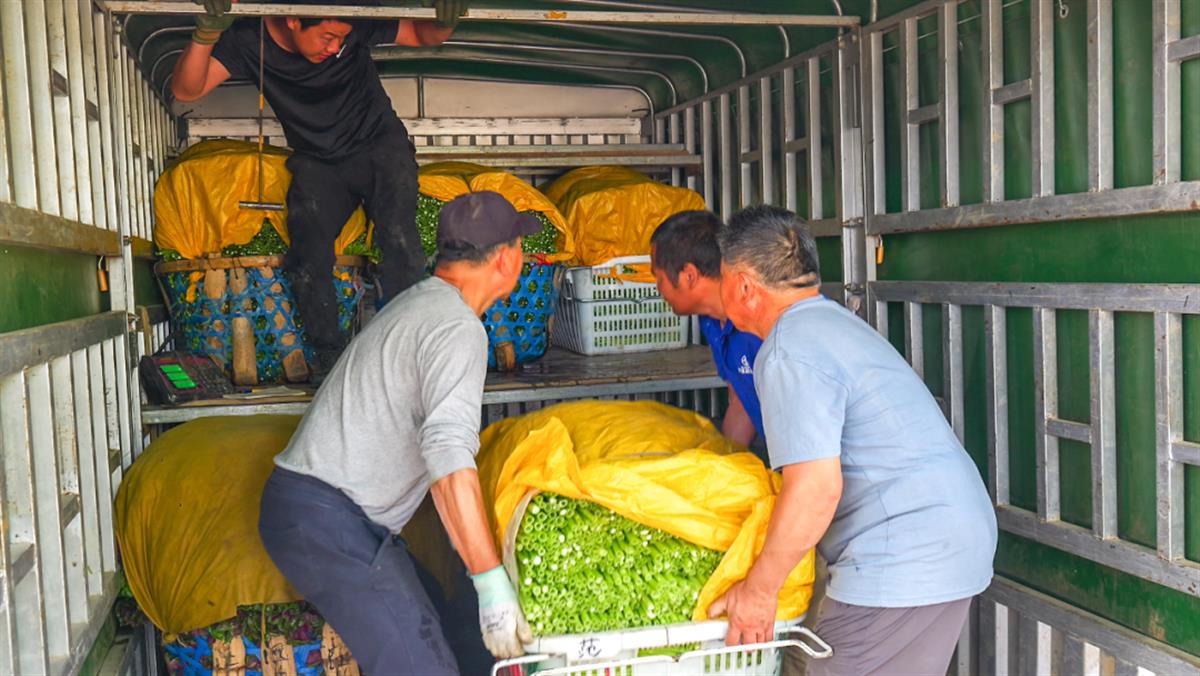 张学友与工友们合力将一筐筐蔬菜搬上车,动作娴熟而默契。