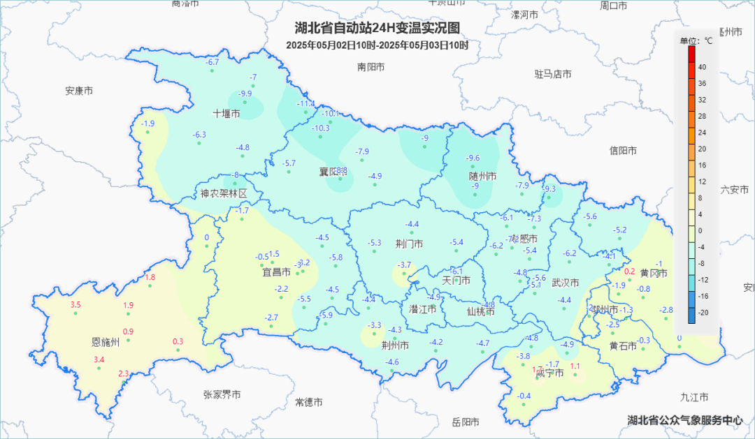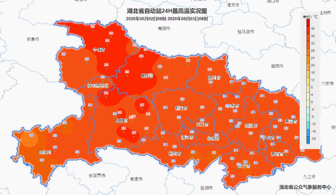 昨日(2日)湖北全省晴天到多云,夜间十堰出现雷阵雨,中东部地区出现6到8级偏北阵风,最大风速为孝感市大悟21m/s(9级)。最高气温升至近期顶峰,西部35~39℃、东部32~35℃,25个县市在35℃以上,其中10个县市超37℃,郧阳最高39.2℃,谷城和南漳还打破了有气象记录以来5月最高气温纪录。