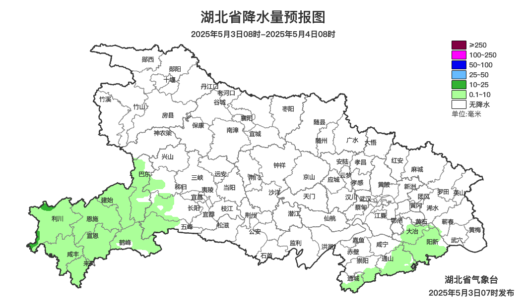 5月3日08时-4日08时,全省多云,其中鄂西南、鄂东南局地有阵雨或雷阵雨,并伴有强对流天气。最高气温鄂西北24~27℃、其他地区28~33℃,最低气温鄂西北13~16℃、其他地区17~20℃,偏北风3到5级、阵风6到9级,晚上转3级、阵风4到5级。