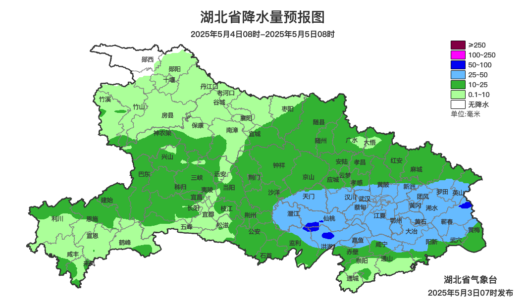 5月4日08时-5日08时,江汉平原、鄂东北、鄂东南多云转中到大雨,局地暴雨;其他地区多云转小到中雨。省内部分地区伴有短时强降水等强对流天气。最高气温西部19~24℃、东部25~29℃,最低气温14~19℃,偏东风转偏北风3级、阵风4到5级。